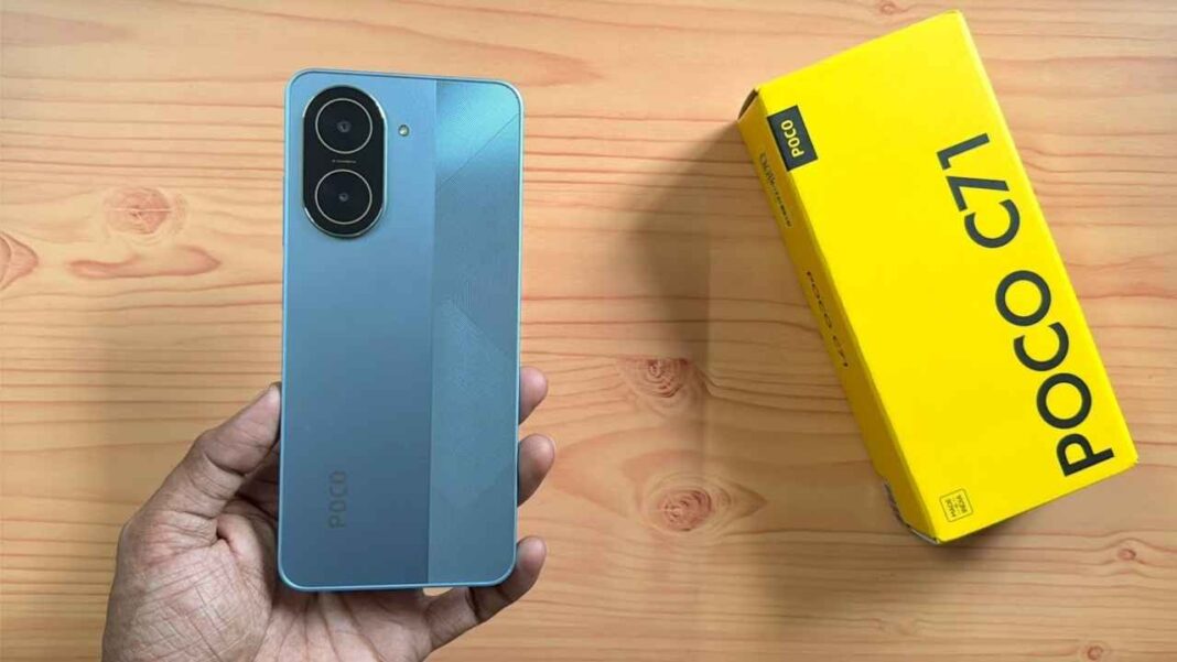 The Poco C71 has a modern look with a “premium split-grid” design and a dual-tone finish on the back. This gives it a look that is often associated with more expensive models. It also has an IP52 rating, which means it can handle some dust and water, which is a nice touch at this price point.
